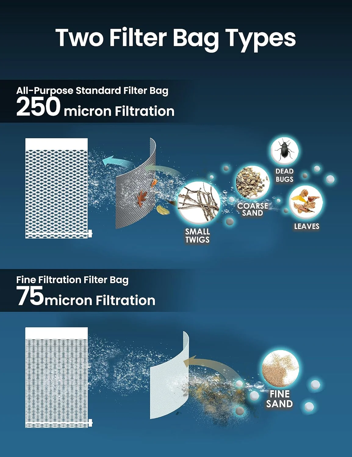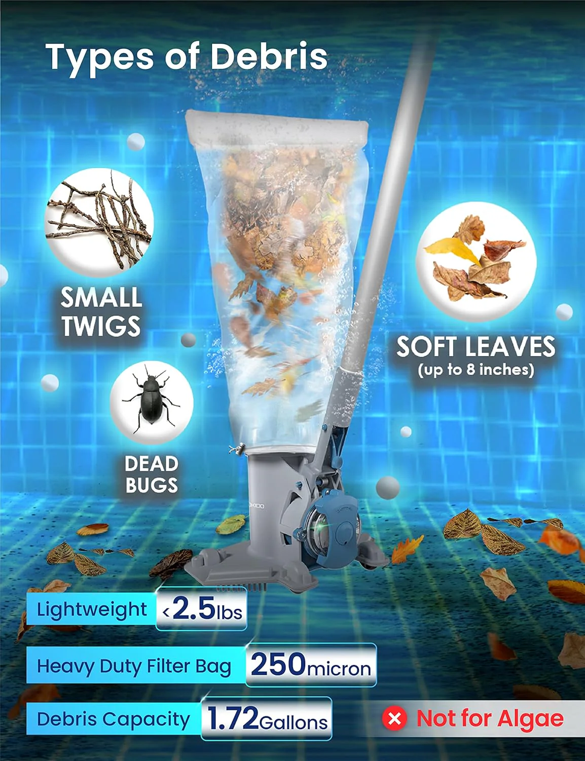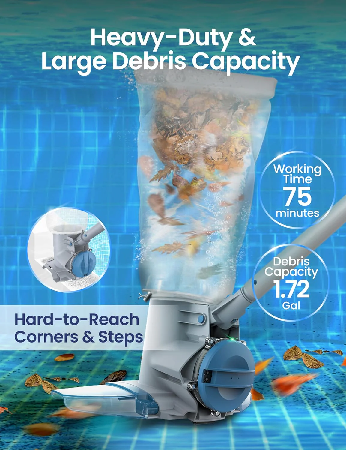 Rechargeable Cordless Pool Leaf Vacuum, 30GPM Strong Suction, 75 min Runtime, XL Heavy Duty Filter Bag, Leaves and Debris Removal, for Above Ground Pool and Inground Pools.